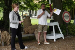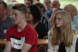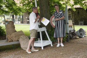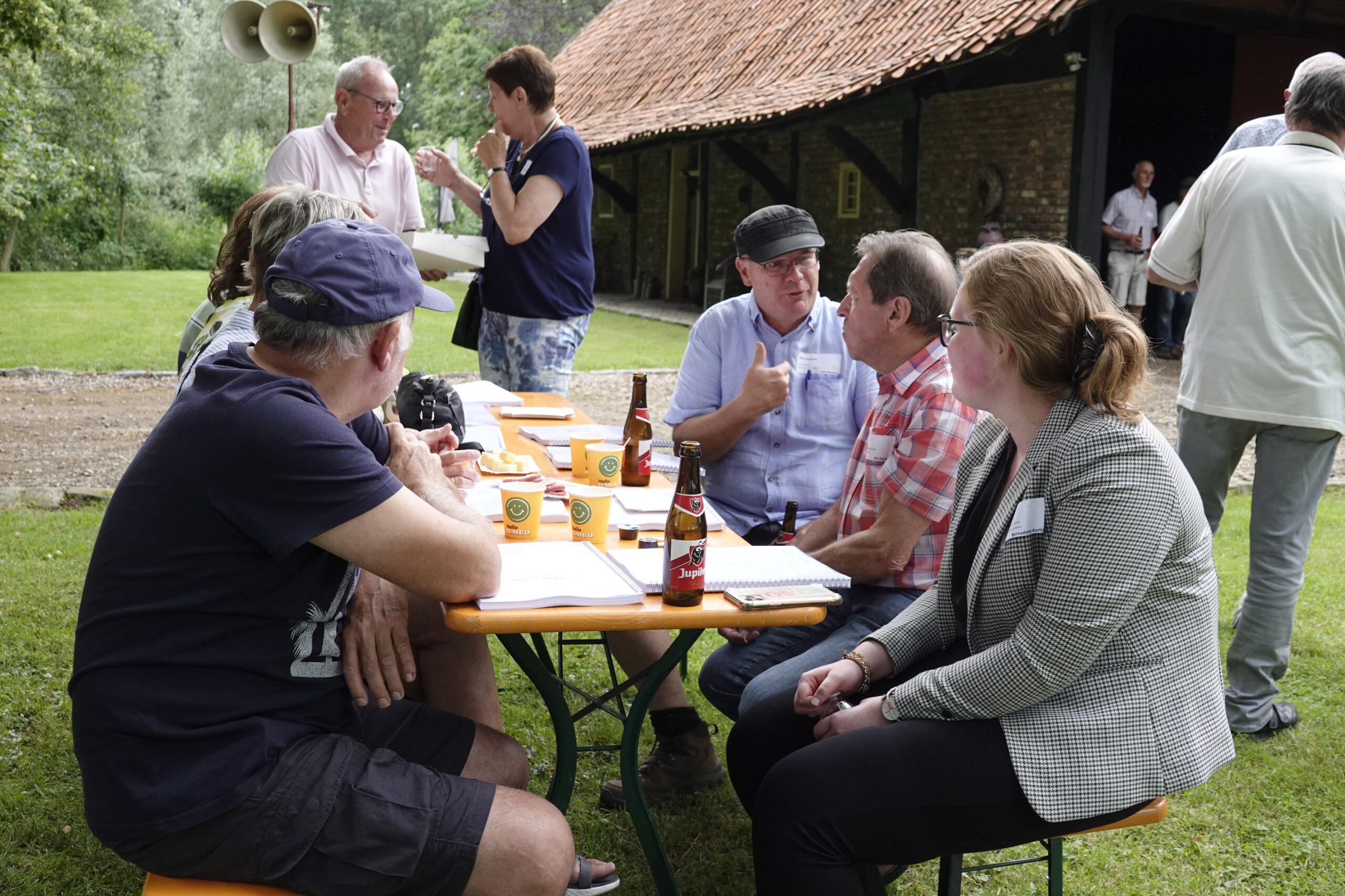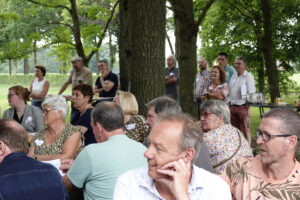 Op zaterdag 3 juli 2021 was de officiële aftrap van het project “Euver de Grens”. Daarin staat een groot buitentoneel gepland in september 2022, met een aantal rand-evenementen. Voor de 45 spelers, waarvan 15 uit België, was het een eerste kennismaking met elkaar, en met de locatie waar gespeeld gaat worden : de Brookmeule. Behalve toneelspelers, waren ook alle hulptroepen uitgenodigd, zoals toneelmeesters, kleding-, grime- en kappershulpen, regie-assistent, soufleuse en productieleider. Daarnaast waren ook vertegenwoordigers van deelnemende verenigingen aanwezig. Samen met het bestuur en de leden van de commissies was het een groot en bont gezelschap. Door schrijver Frits Criens werd verteld over het spelen in zo’n grote productie. Regisseur Johan Korten (vanne Braobenjer) reikte aan alle spelers het “boekje” uit, waarin elk personage werd toegelicht. Dat werd een lichtvoetig en amusant verhaal, waarin grote delen van het stuk al werden toegelicht. De hele groep was ruim 80 personen groot, die met elkaar een gezellige middag beleefden, en alvast sfeer konden proeven van de locatie, het toneelstuk en de groep.
